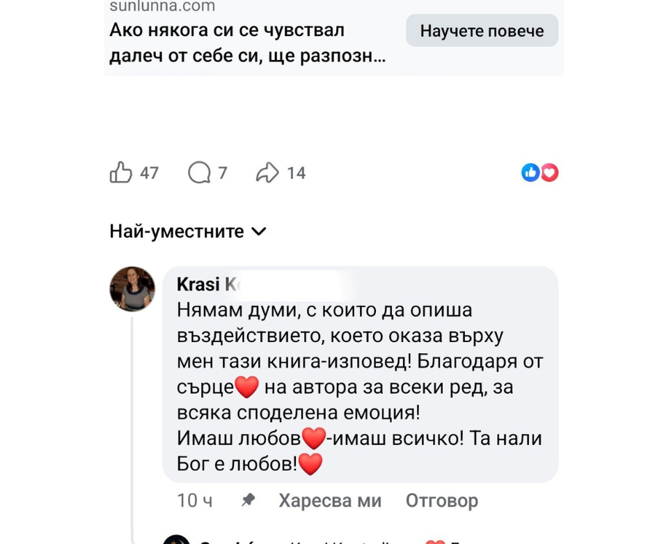 Нямам думи, с които да опиша въздействието, което оказа върху мен тази кига-изповед! Благодаря от сърце на автора за всеки ред, за всяка споделена емоция! Имаш любов – имаш всичко! Та нали Бог е любов!